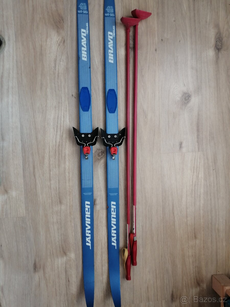Prodám běžky JARVINEN BRAVO délka 135cm MADE IN FINLAND. Skluznice originál upravená na stoupání. Kdo by měl zájem a měl nové boty zařídil bych předělání vázání na novější a označení mazací komory. Podle váhy.