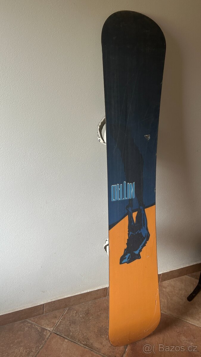 Snowboard: Značka Nano, design s motivem ohně. Deska je jetá, skluznice nese běžné známky používání (viz foto), ale je připravena k další jízdě.