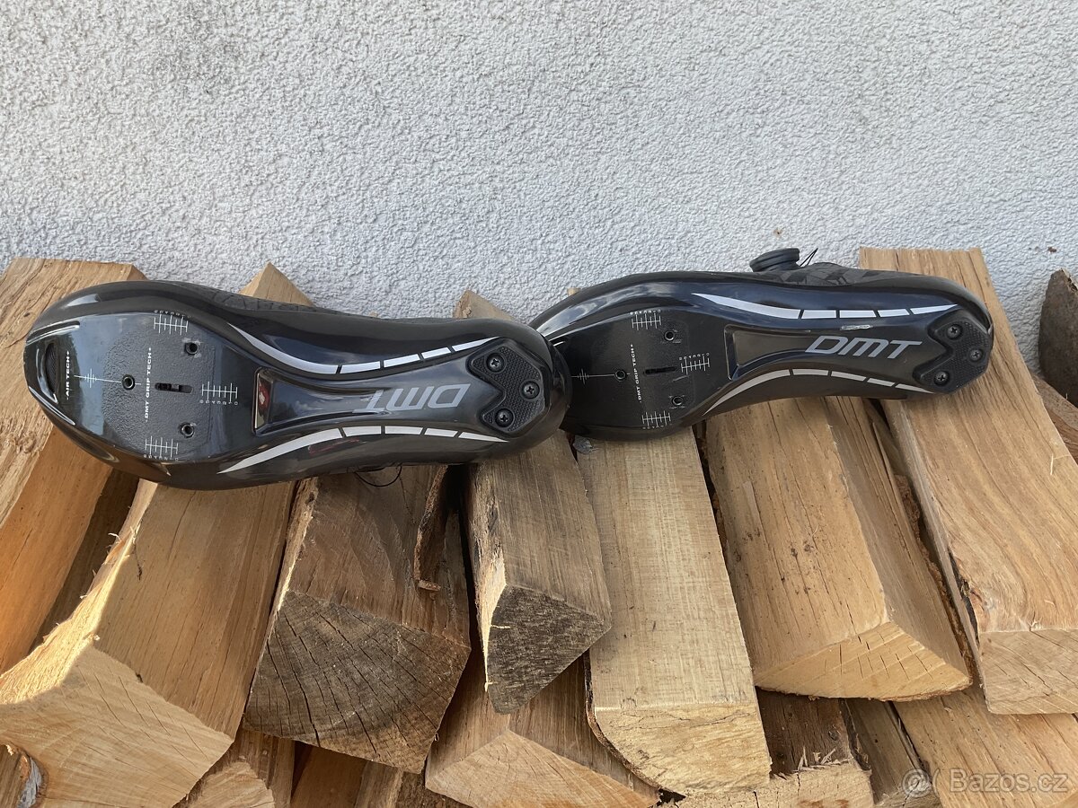 Pánské silniční tretry DMT KR 30, černé, vel. 45.5 - [24.3. 2026]Nákup 11/2025, najeto do 500 km, cca 7 vyjížděk. Vyjma podrážky a stop od popocházení boty nejeví známky použití. Jsou užší, nezvykl jsem si. Velikost 45.5, originální pytlík.