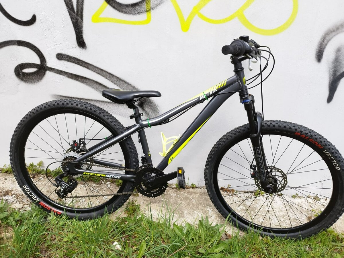 Dětské horské kolo Arcore Metrik. Kolo je v dobrém stavu, málo používané. Téměř nové pláště. Má malou velikost rámu 13,5" a velikost kol 26". Vhodné pro výšku postavy ссa od 135-140 cm. Má kotoučové mechanické brzdy. Telefonní číslo 607754571