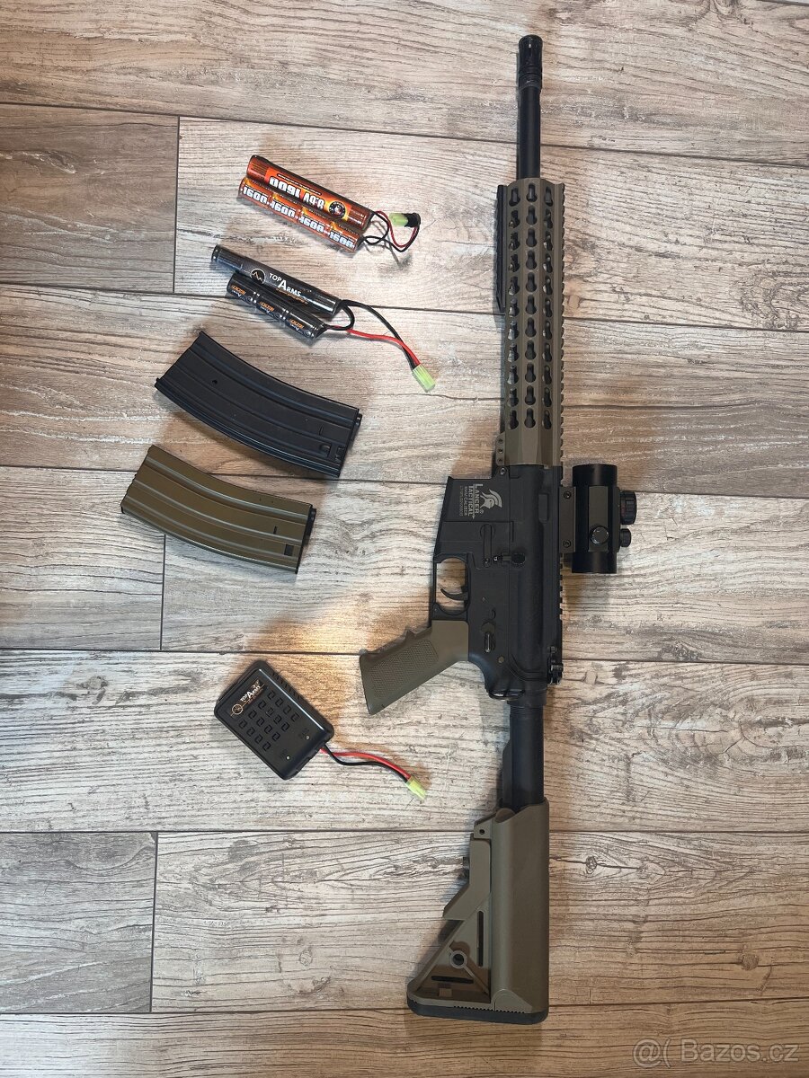 Dobrý den. prodám airsoftovou repliku M4 Keymod Sportline značky Lancer Tactical s kolimátorem THO-209+ 2 točné zásobníky + 2 NiMH baterie a chytrá nabíječka. Pořizovací cena byla cca 7500kč.