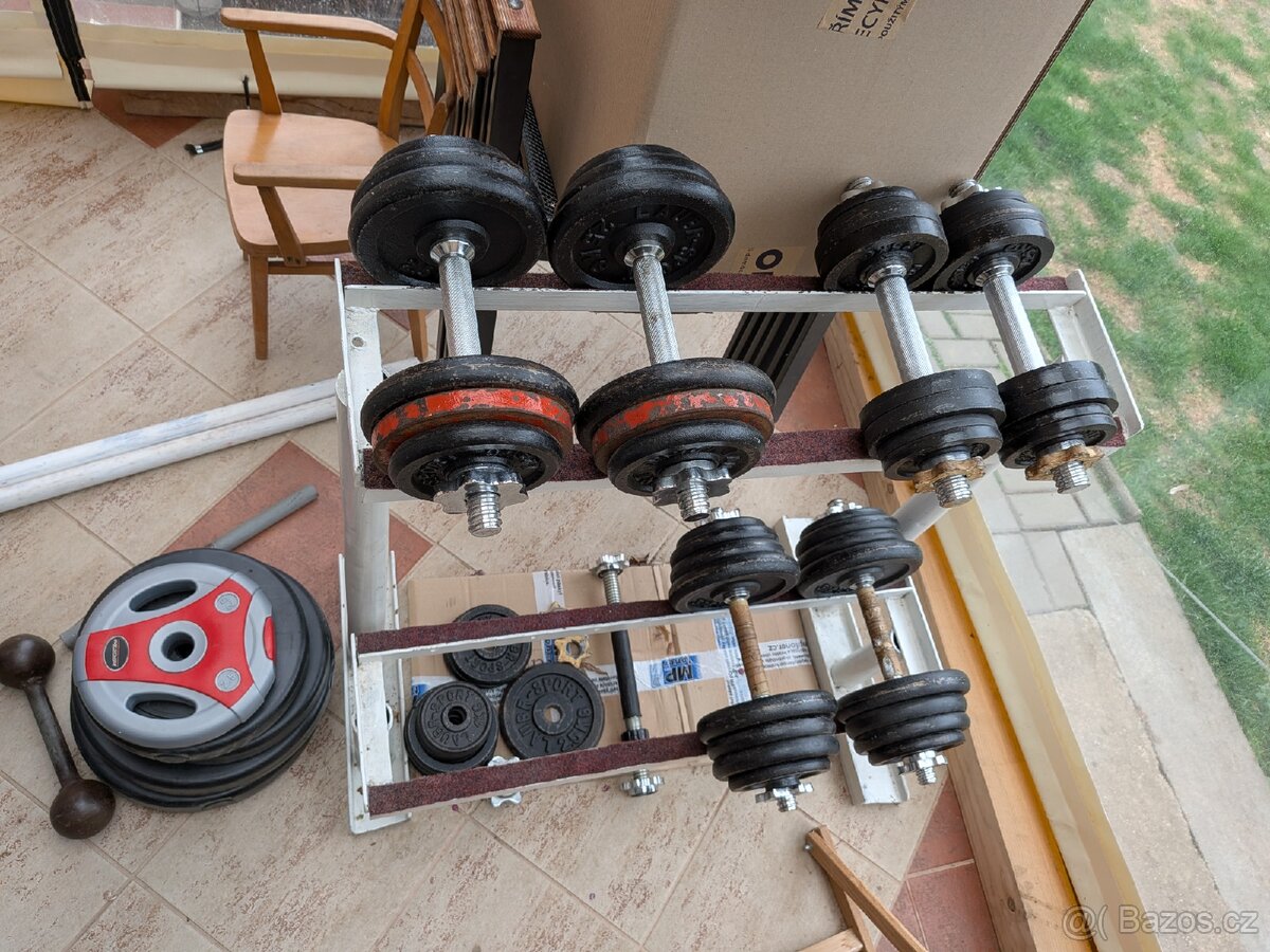 Sada na posilování - [20.4. 2026]Obojí téměř nepoužité kvalitní masivní značkové vybavení za půlku pc osobně Vlašim nebo na trase do ČB možné i zvlášť v případě zájmu mám i osy závaží jednoručky atd