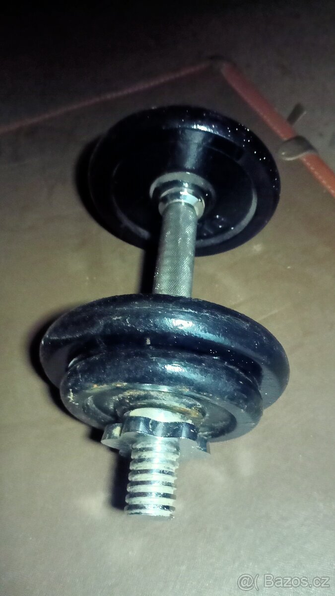 Prodám tuto činku která se skládá z tyče – 2 kg, dvou závaží každé hmotnost 2,5 kg, a dvou závaží každé hmotnost 1,5 kg