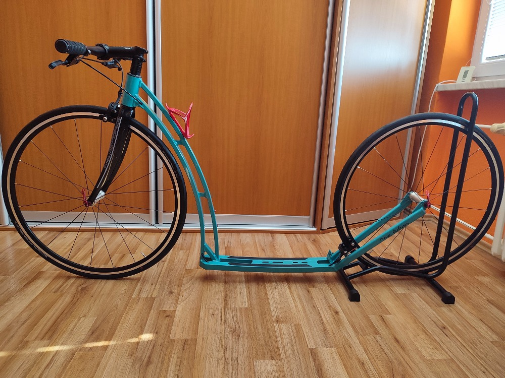 Prodám kvalitní koloběžku Mibo Revoolution 2x28. Koloběžka je na nových zapletených dvoustěnných ráfcích ALCYON Kostka (náboje Kostka HK 1020 RS, průmyslová ložiska se sníženým třením), nových pláštích Schwalbe One 25 mm, karbonové vidlici Force carbon, brzdových pákách Shimano Sora, brzdových čelistech Campagnolo Centaur, nových brzdových špalcích Shimano, nových řídítkách a nových rozích Force.