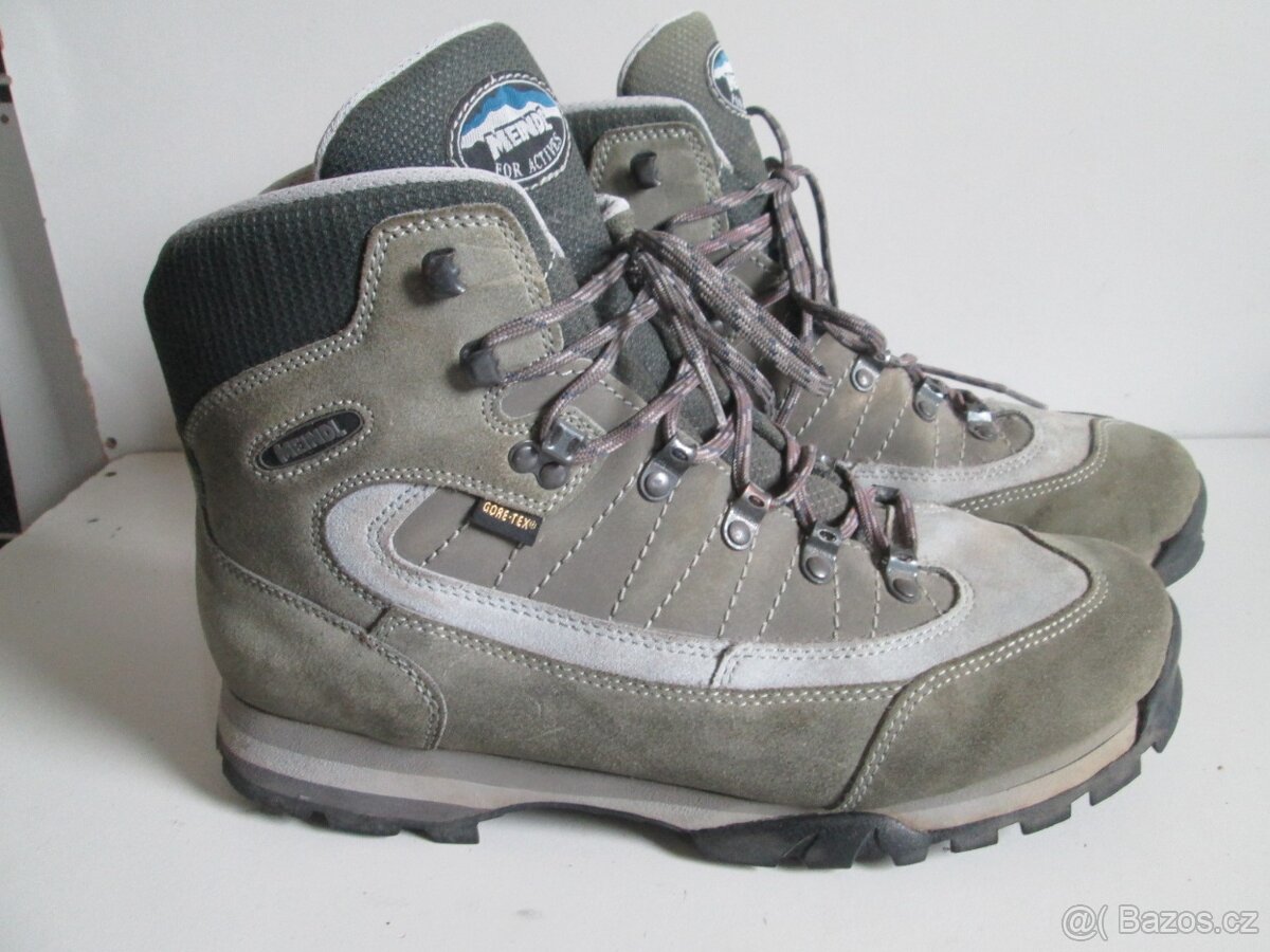 Kožené trekové boty Meindl s goreTexovou membránou.Velikost 43,5,délka stelky 28,5 cm.Lehký,pohodlný model na celodenní nošení.Velmi dobrý stav.Minimálně nošené.Vysoká pořizovací cena