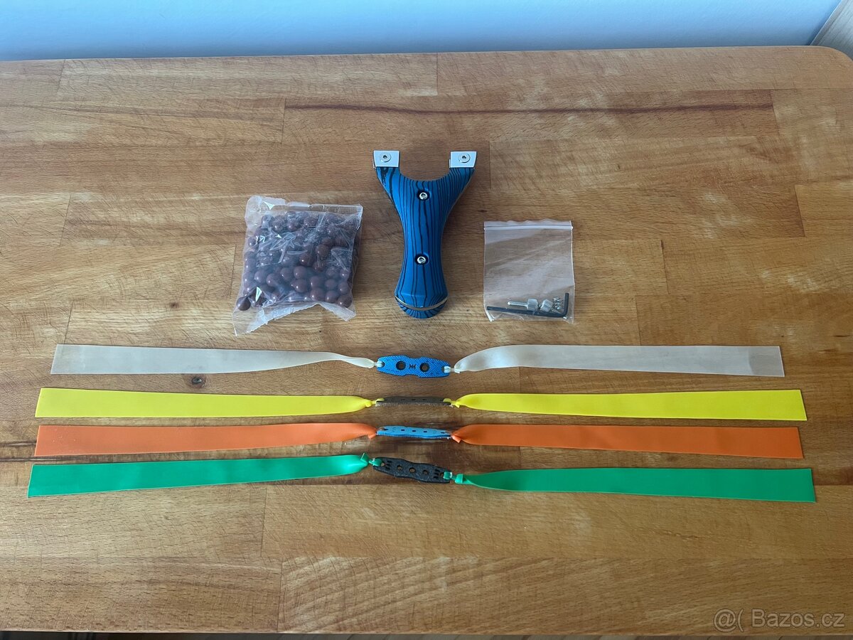 K praku přidám: 4x náhradní gumu (0.4,0.5,0.55 a 0.6mm), 100g hliněných kuliček, drobnosti k praku.