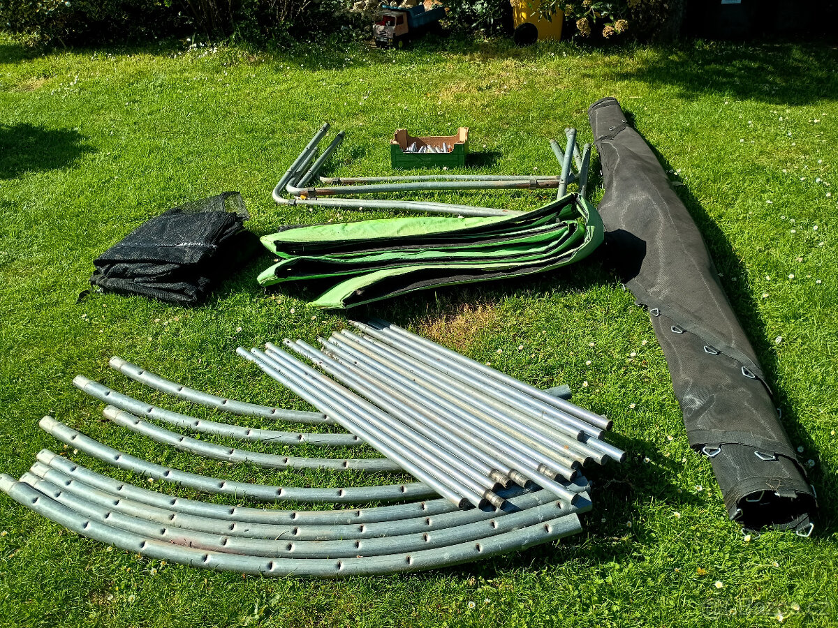 Trampolína má pouze částečně poškozený zip, ale zavřít se dá. Jinak je v pořádku.