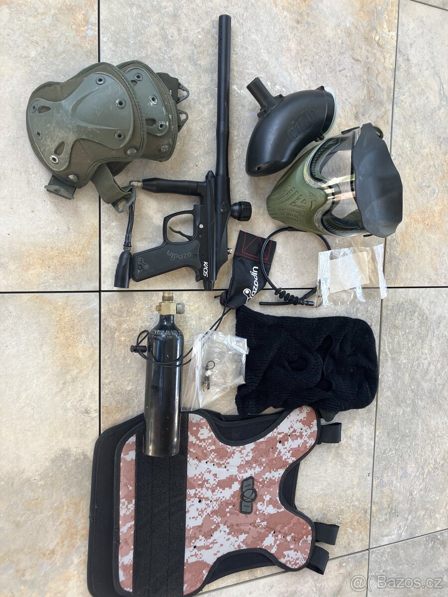 Prodám Azodin Kaos, maska Helix single, zásobník, kukla, 12 oz CO2 láhev s on/off ventilem, chrániče loktů, čištění, ochranná vesta, sada náhradních dílů a imbusy. Vše plně funkční, promázáno, přetěsněno.