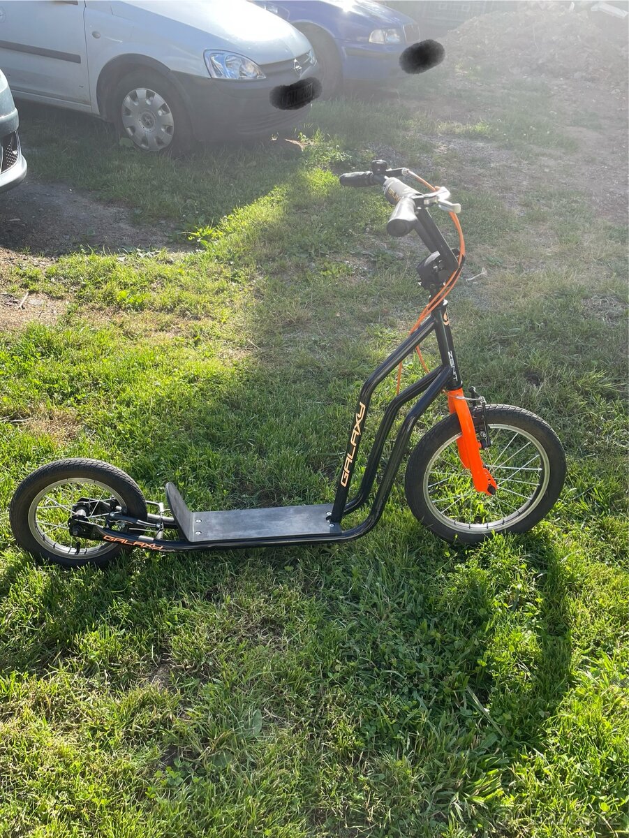 Koloběžka MASTER 16-12 s nafukovacími koly v černo-oranžové barvě.